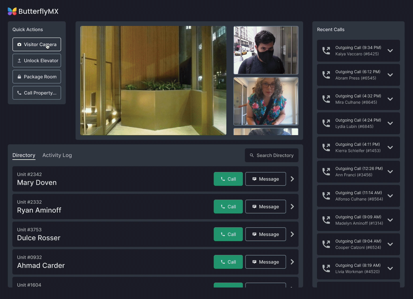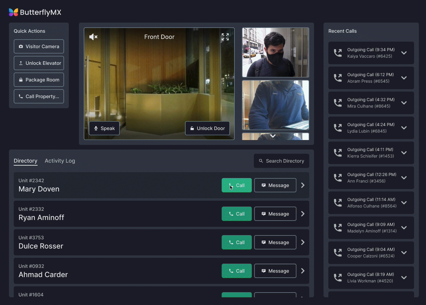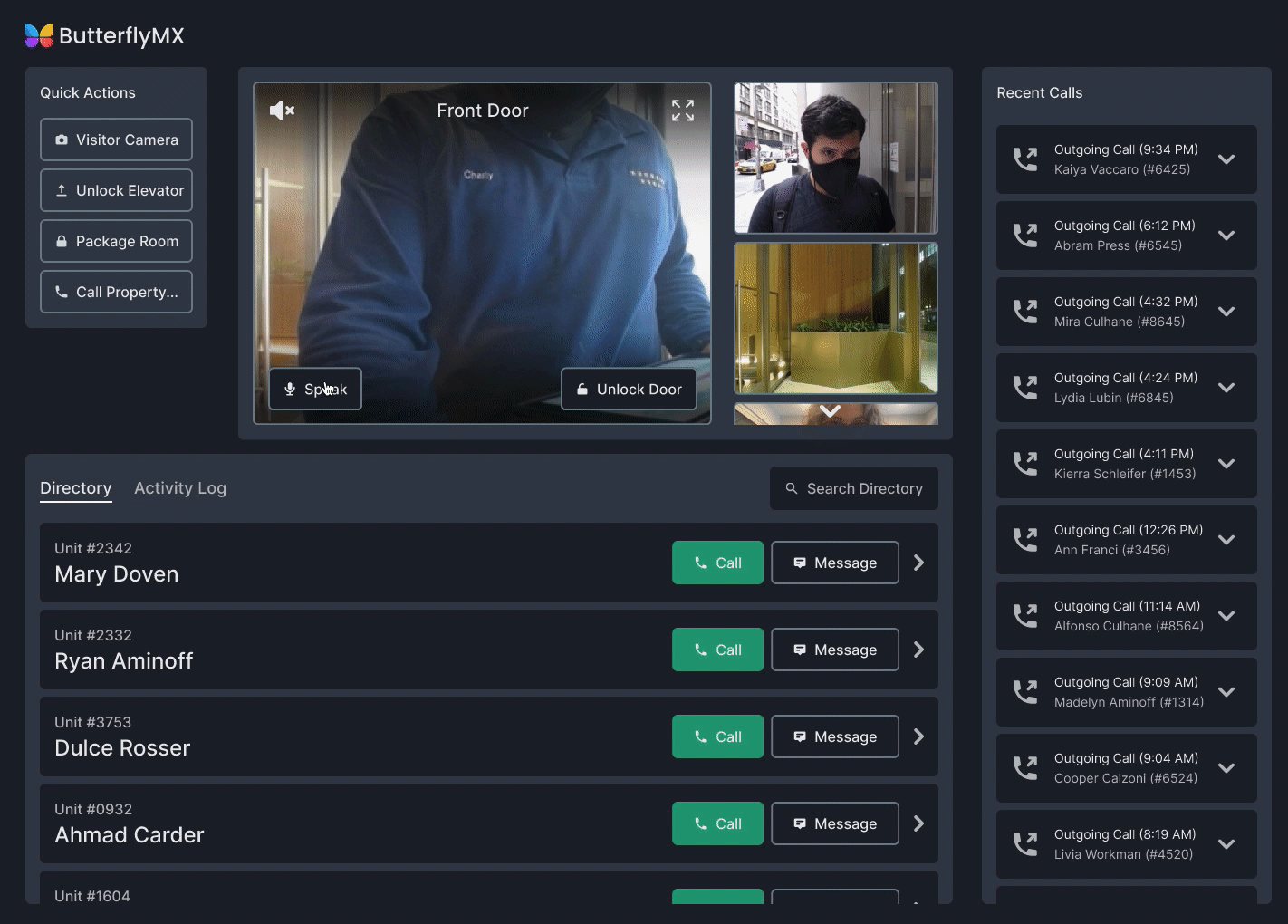 Front desk staff can view video feeds from ButterflyMX intercoms and are able to speak, listen, and unlock the door from their workstation. They are also able to switch their focus to other intercoms throughout the property.