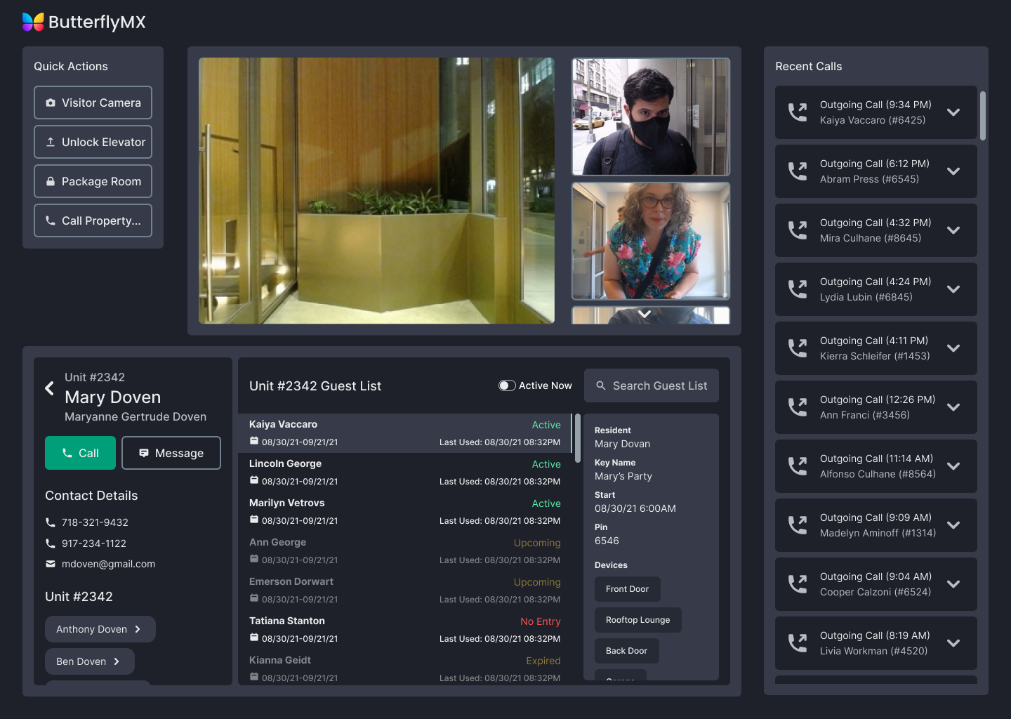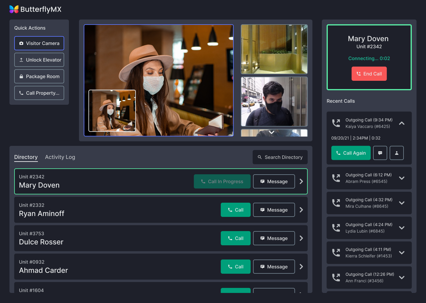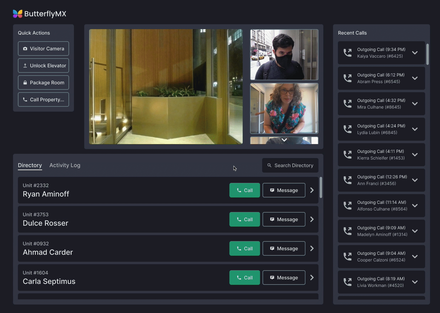 Front desk staff can view video feeds from ButterflyMX intercoms and are able to speak, listen, and unlock the door from their workstation. They are also able to switch their focus to other intercoms throughout the property.
