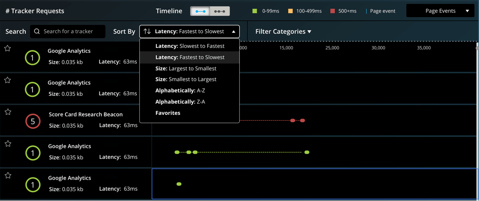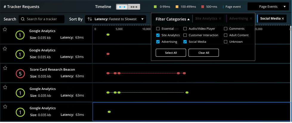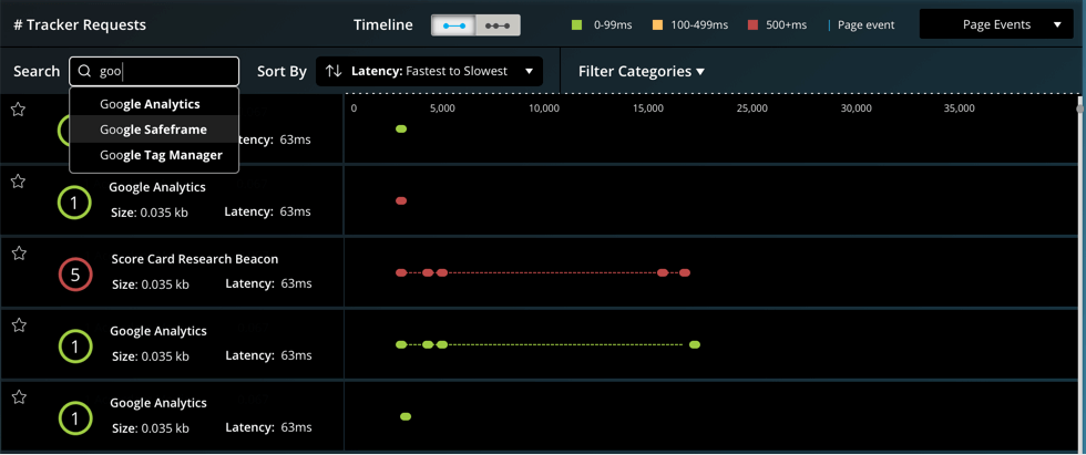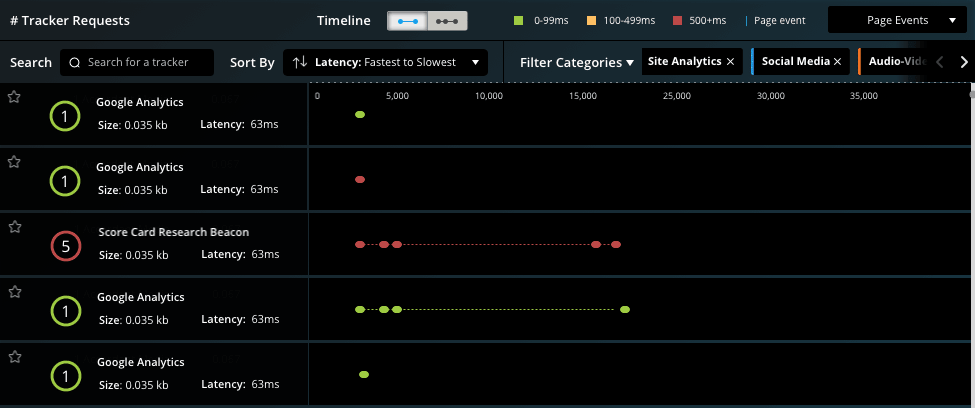 The tracker timeline shows all the trackers that exist on a given website. On more complex pages, it could get tedious for users to find and analyze specific trackers.